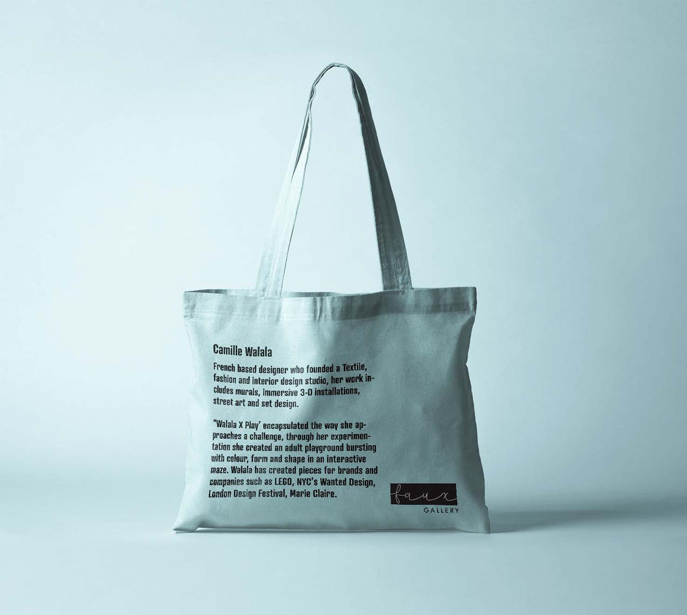 Introducing FAUX GALLERY's recent project, where two unique tote bag designs have been created to serve as both merchandise and advertisement for the gallery's two new exhibitions. Each design is dedicated to the incredible artistry of Saul Bass and Camille Walala, with the bags reflecting the individual style and inspiration of each artist.